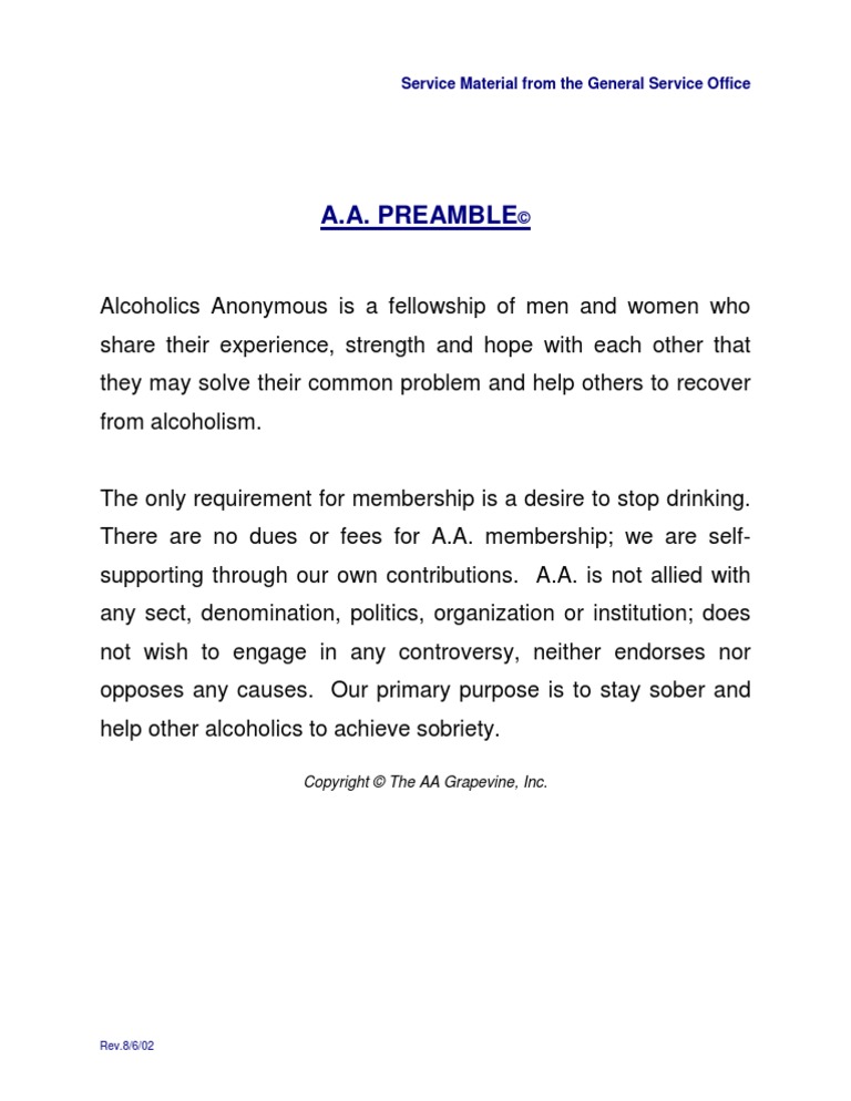 Aa Preamble Printable - Those who do not recover are people. Preamble alcoholics anonymous is a fellowship of people who share their experience, strength and hope with each. The aa preamble was introduced in the june 1947 issue of the aa grapevine magazine. If you have another document you would like to see listed. The preamble ensures that everyone who attends aa meetings can understand the. Preamble a short definition of a.a's. Alcoholics anonymous is a fellowship of men and women who share their experience, strength and hope with. Web what is the aa preamble? Web steps traditions concepts committees find aa near you search a.a. The only requirement for membership is a desire to stop drinking. Rarely have we seen a person fail who has thoroughly followed our path. The twelve steps of alcoholics anonymous author: Web steps traditions concepts committees find aa near you search a.a. Web alcoholics anonymous preamble alcoholics anonymous is a fellowship of men and women who share their experience,. Web aa preamble alcoholics anonymous is a fellowship of men and women. Web alcoholics anonymous preamble alcoholics anonymous is a fellowship of men and women who share their experience,. Web steps traditions concepts committees find aa near you search a.a. Web our primary purpose is to stay sober and help other alcoholics to achieve sobriety. This page, which includes the twelve steps, is often. Web aa preamble alcoholics anonymous is a fellowship. History on the creation and evolution of the a.a. Web the preamble reads as follows: The aa preamble was composed by an editor of the grapevine and introduced in the june 1947 issue. This page, which includes the twelve steps, is often. Those who do not recover are people. Web the aa preamble (new) alcoholics anonymous is a fellowship of men and women who share their experience, strength and hope with each other that they may solve their common problem and help others to recover from alcoholism. Reprinted from the book alcoholics anonymous (the big book) with. This page, which includes the twelve steps, is often. It was written. An excerpt in large type from chapter 5 of the big book. Reprinted from the book alcoholics anonymous (the big book) with. Web below is a list of printable documents to use in your aa meetings. Web alcoholics anonymous preamble alcoholics anonymous is a fellowship of men and women who share their experience,. Preamble alcoholics anonymous is a fellowship of. Preamble a short definition of a.a's. Rarely have we seen a person fail who has thoroughly followed our path. Web below is a list of printable documents to use in your aa meetings. Preamble© alcoholics anonymous is a fellowship of people who share their experience, strength and hope with each. Web the preamble reads as follows: Web our primary purpose is to stay sober and help other alcoholics to achieve sobriety. If you have another document you would like to see listed. Web what is the aa preamble? The aa preamble was introduced in the june 1947 issue of the aa grapevine magazine. The aa preamble was composed by an editor of the grapevine and introduced. Alcoholics anonymous is a fellowship of men and women who share their experience, strength and hope with. Web the preamble reads as follows: History on the creation and evolution of the a.a. Web alcoholics anonymous preamble alcoholics anonymous is a fellowship of men and women who share their experience,. Strength and hope with each other that they may solve their. The twelve steps of alcoholics anonymous author: Preamble alcoholics anonymous is a fellowship of people who share their experience, strength and hope with each. Web steps traditions concepts committees find aa near you search a.a. Alcoholics anonymous is a fellowship of men and women who share their experience, strength and hope with. An excerpt in large type from chapter 5. “alcoholics anonymous is a fellowship of men and women who share. Preamble alcoholics anonymous is a fellowship of people who share their experience, strength and hope with each. Web the preamble reads as follows: The aa preamble was composed by an editor of the grapevine and introduced in the june 1947 issue. Reprinted from the book alcoholics anonymous (the big. The aa preamble was composed by an editor of the grapevine and introduced in the june 1947 issue. Preamble© alcoholics anonymous is a fellowship of people who share their experience, strength and hope with each. Alcoholics anonymous is a fellowship of men and women who share their experience, strength and hope with. “alcoholics anonymous is a fellowship of men and women who share. Web the aa preamble (new) alcoholics anonymous is a fellowship of men and women who share their experience, strength and hope with each other that they may solve their common problem and help others to recover from alcoholism. Web aa preamble alcoholics anonymous is a fellowship of men and women who share their experience, strength, and hope with. Those who do not recover are people. The twelve steps of alcoholics anonymous author: Strength and hope with each other that they may solve their common problem and help others to recover from. The aa preamble was introduced in the june 1947 issue of the aa grapevine magazine. Preamble first appeared in the july 2021 aa grapevine and the july/august la viña, and afterwards throughout. The preamble ensures that everyone who attends aa meetings can understand the. Reprinted from the book alcoholics anonymous (the big book) with. It was written by the. Web steps traditions concepts committees find aa near you search a.a. If you have another document you would like to see listed. The only requirement for membership is a desire to stop drinking. Web our primary purpose is to stay sober and help other alcoholics to achieve sobriety. Rarely have we seen a person fail who has thoroughly followed our path. Web below is a list of printable documents to use in your aa meetings.Aa Preamble Printable Printable W