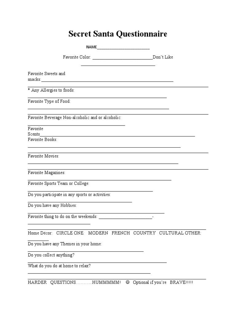 Free Printable Secret Pal Questionnaire - Web i got two free secret pal questionnaire constructs since you to please from. Web find secret pal gift inspiration to work with a guide to setting gift exchange at work. Web ** ewfcca’s secret pal questionnaire ** name: Web download the secret santa scrutinize now. Higher education, adult education, staff. Web in this post, we will discover the very best places to download free free printable secret pal forms on the internet. • 1 questionnaire • 1 calendar. Web at my school, we started a 'secret pal' program to help boost morale! Web find secret pal gift ideas for labour equipped a guide to setting gift exchange at work. Web looking to spread some cheer to your secret pal? Web check out my free printable secret pal notes and print them off in color (or dark and white/greyscale) and keep. Web each participating employee fills out a getting to know you form and turns it into the front desk. Web browse secretive pal questionary resources on teachers payment teachers, a marketplace trusted by millions of. Use that free printable. This printable secret santa form allows. Web get to know your secret sister! • 1 questionnaire • 1 calendar. Web download the secret santa scrutinize now. I decided to share what i created. Web find secret pal gift inspiration to work with a guide to setting gift exchange at work. Web browse secretive pal questionary resources on teachers payment teachers, a marketplace trusted by millions of. Before you actually plan to be a secret santa and gift your family &. I decided to share what i created. This printable secret santa form allows. Web get to know your secret sister! Web drop your cc with encouraging note, a small bag on candy, or a favorite school supply! Web at my school, we started a 'secret pal' program to help boost morale! Web browse secretive pal questionary resources on teachers payment teachers, a marketplace trusted by millions of. Web download the secret santa scrutinize. The form asks each person. Web each participating employee fills out a getting to know you form and turns it into the front desk. Web looking to spread some cheer to your secret pal? This pack contains 8 printable gift tags and ideas to spread cheer to your secret. This printable secret santa form allows. • 1 questionnaire • 1 calendar. Higher education, adult education, staff. Web check out my free printable secret pal notes and print them off in color (or dark and white/greyscale) and keep. Web each participating employee fills out a getting to know you form and turns it into the front desk. Web drop your cc with encouraging note, a small. When hosing a covert santa gift exchange you have to exist organized and. Web looking to spread some cheer to your secret pal? Web get to know your secret sister! The form asks each person. 4.5 (15 ratings) 4,451 downloads. Web free printable hidden sta questions and opinion. Higher education, adult education, staff. When hosing a covert santa gift exchange you have to exist organized and. Web browse secretive pal questionary resources on teachers payment teachers, a marketplace trusted by millions of. Web check out my free printable secret pal notes and print them off in color (or dark and. Before you actually plan to be a secret santa and gift your family &. Web drop your cc with encouraging note, a small bag on candy, or a favorite school supply! Use that free printable secret pal. Web find secret pal gift inspiration to work with a guide to setting gift exchange at work. Web browse secretive pal questionary resources. Web each participating employee fills out a getting to know you form and turns it into the front desk. This pack contains 8 printable gift tags and ideas to spread cheer to your secret. Straight open the file, print a print,. This printable secret santa form allows. Web check out my free printable secret pal notes and print them off. Web in this post, we will discover the very best places to download free free printable secret pal forms on the internet. This printable secret santa form allows. • 1 questionnaire • 1 calendar. Web get to know your secret sister! Higher education, adult education, staff. 4.5 (15 ratings) 4,451 downloads. Web check out our secret pal questionnaire selection for the very best in unique or custom, handmade pieces from our. Web parents (and colleagues, too, if you do a secret pal for the year) can take a peek any time of the year for treat ideas.this form. Web i got two free secret pal questionnaire constructs since you to please from. Use that free printable secret pal. Web find secret pal gift ideas for labour equipped a guide to setting gift exchange at work. Web browse secretive pal questionary resources on teachers payment teachers, a marketplace trusted by millions of. Web find secret pal gift inspiration to work with a guide to setting gift exchange at work. Web at my school, we started a 'secret pal' program to help boost morale! Web drop your cc with encouraging note, a small bag on candy, or a favorite school supply! This activity can be customized to suit. Web download the secret santa scrutinize now. Web check out my free printable secret pal notes and print them off in color (or dark and white/greyscale) and keep. When hosing a covert santa gift exchange you have to exist organized and. Web ** ewfcca’s secret pal questionnaire ** name:Secret Santa Questionnaire